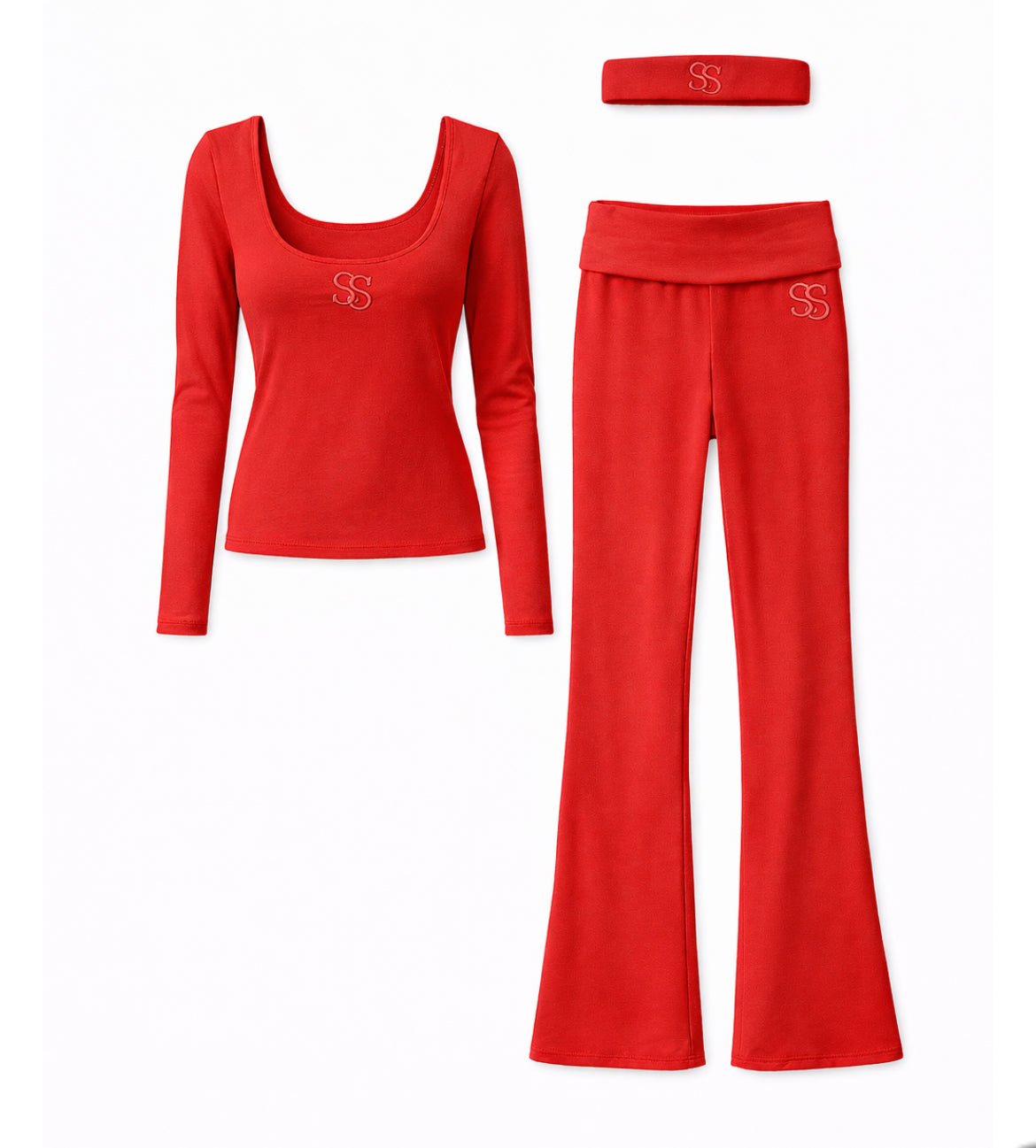 The high-waisted flare pants are crafted with a smooth fold-over waistband and a graceful silhouette that elongates the leg. Finished in an ultra-soft, stretch fabric with subtle embroidered detailing and a matching headband, this set blends understated luxury with everyday ease.